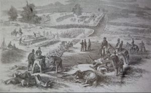 Like their neighbors, the Roulettes were left with damage to their buildings and devastating losses to the crops, fields and fencing. The traumatic sight of dead bodies strew across their property and in the road was unbearable. After the battle Union soldiers began burying their dead across the fields, near the roads and hedgerows and marking the graves. Two days later, Union burial crews drug the bodies out of the lane and buried the Confederate soldiers in long shallow graves on both side of the Roulette Farm Lane. Mr. Roulette would say that over 700 bodies were buried on his property.