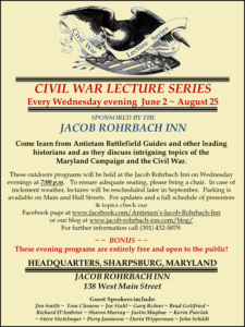 We are excited to begin our sixth year of hosting the Civil War Lecture Series. Since we started, we’ve raised over $1800 for the Save Historic Antietam Foundation through our summer fundraiser. We have several returning guest speakers presenting and another outstanding slate of lectures scheduled at the Jacob Rohrbach Inn. Come learn from Antietam Battlefield Guides and other leading historians as they discuss intriguing topics of the Maryland Campaign and the Civil War during our summer lecture series.
