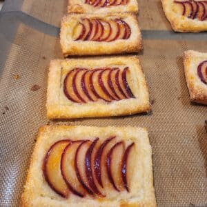 Bake for 15 minutes for individual tarts or 20–30 minutes for whole sheet, or until the frangipane is set and golden brown and the pastry edges are puffed and golden brown. Once baked, let the tart cool slightly on a wire rack.